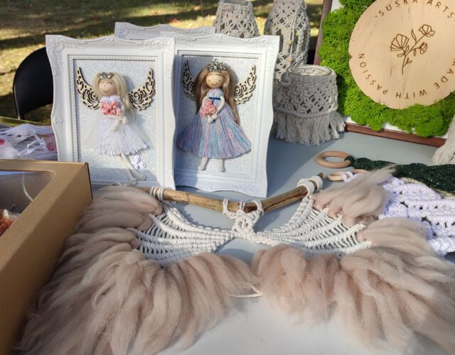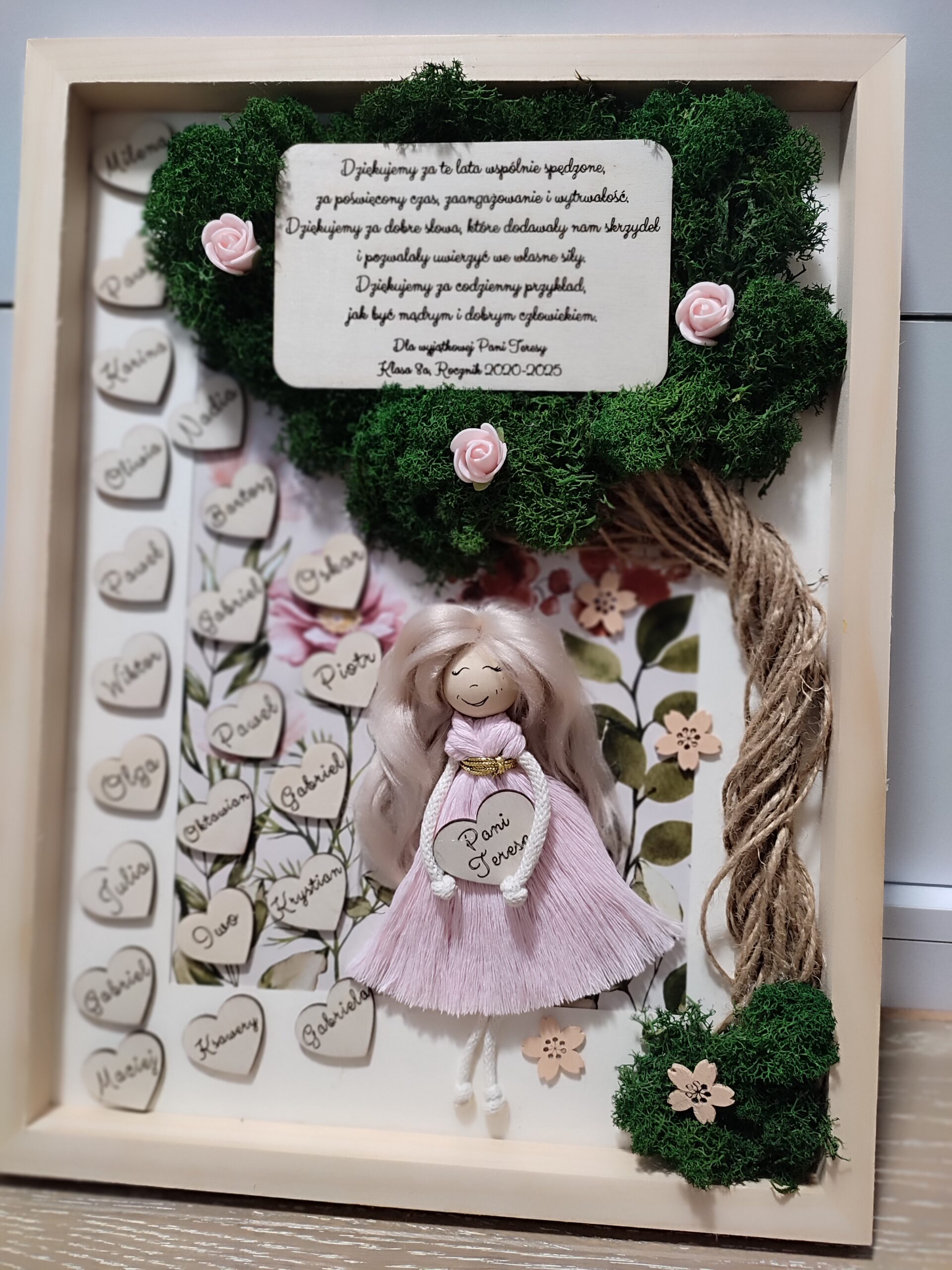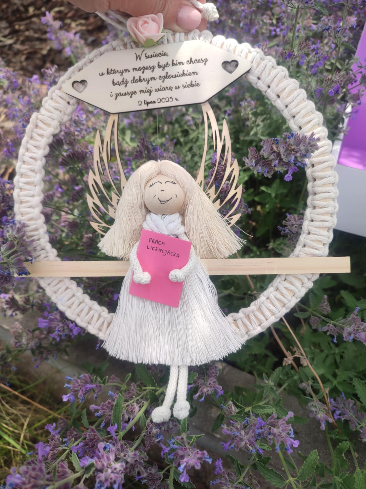 Spod jej rąk wychodzą różnorodne, unikalne wyroby: od makram ściennych, lampionów i ozdób świątecznych po delikatne aniołki w ramkach z personalizacją oraz zakładki do książek. We florystyce tworzy dekoracje z kwiatów żywych, wianki na głowę i drzwi, a także kompozycje na cmentarz. Inspiracją dla Pani Joanny jest drugi człowiek oraz region, z którego pochodzi.